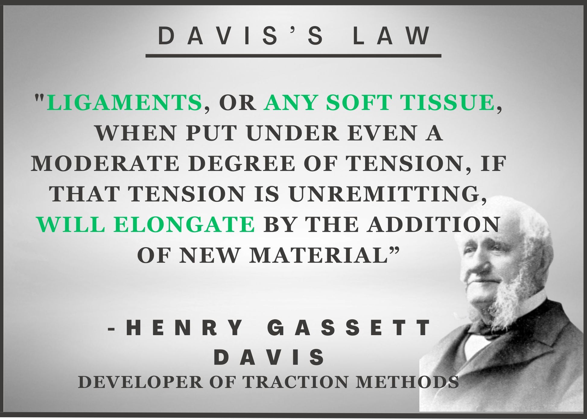 "Ligaments, or any soft tissue, when put under even a moderate degree of tension, if that tension is unremitting, will elongate by the addition of new material" - Henry Gassett Davis
